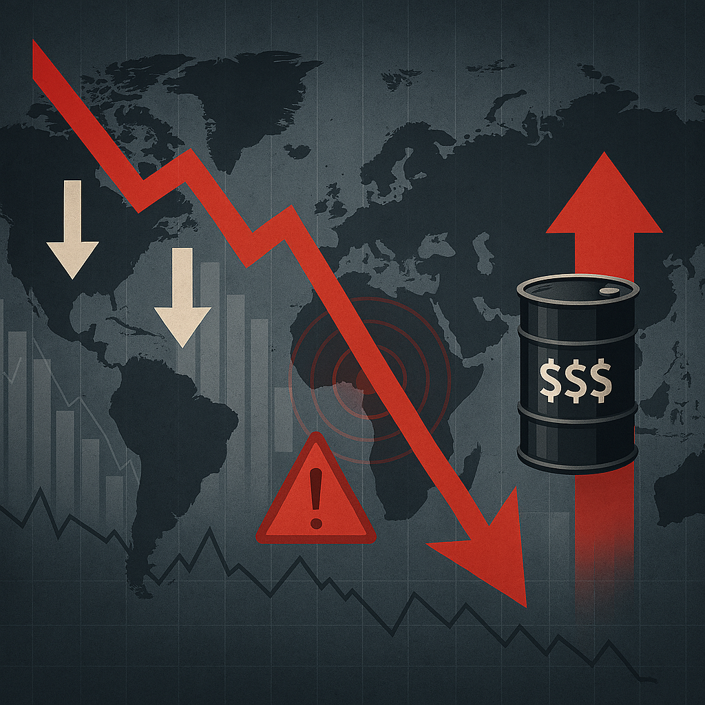 Map of global financial markets with falling stock indicators and rising oil prices, symbolizing economic turmoil triggered by the Gulf conflict and the closure of the Strait of Hormuz.
