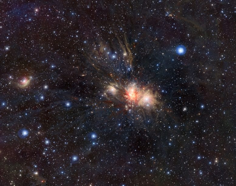 This view shows part of the very active star-forming region around the Tarantula Nebula in the Large Magellanic Cloud, a small neighbour of the Milky Way. At the exact centre lies the brilliant but isolated star VFTS 682 and to its lower right the very rich star cluster R 136. The origins of VFTS 682 are unclear — was it ejected from R 136 or did it form on its own? The star appears yellow-red in this view, which includes both visible-light and infrared images from the Wide Field Imager at the 2.2-metre MPG/ESO telescope at La Silla and the 4.1-metre infrared VISTA telescope at Paranal, because of the effects of dust. Credit: ESO/M.-R. Cioni/VISTA Magellanic Cloud survey. Acknowledgment: Cambridge Astronomical Survey Unit