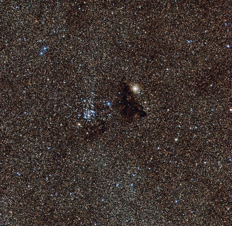 This image from the Wide Field Imager on the MPG/ESO 2.2-metre telescope at ESO’s La Silla Observatory in Chile, shows the bright star cluster NGC 6520 and its neighbour, the strangely shaped dark cloud Barnard 86. This cosmic pair is set against millions of glowing stars from the brightest part of the Milky Way — a region so dense with stars that barely any dark sky is seen across the picture. Credit: ESO