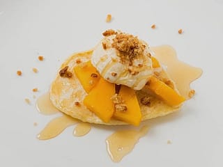 5. Top with a scoop of vanilla ice cream, sliced mango and crumbled Anzac biscuits.